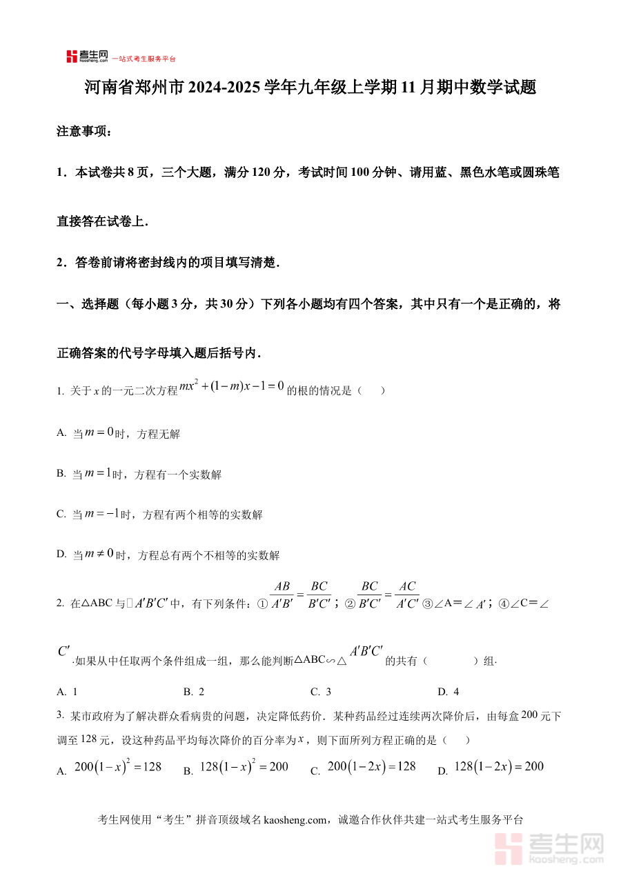 《精品解析:河南省郑州市2024-2025学年九年级上学期11月期中数学试题(原卷版)》是针对河南省郑州市2024至2025学年九年级上学期11月期中数学考试编写的备考资料,精准匹配该地区该学年九年级学生的阶段性学习进度与考试要求,为学生提供贴合本地教学实际的练习资源。