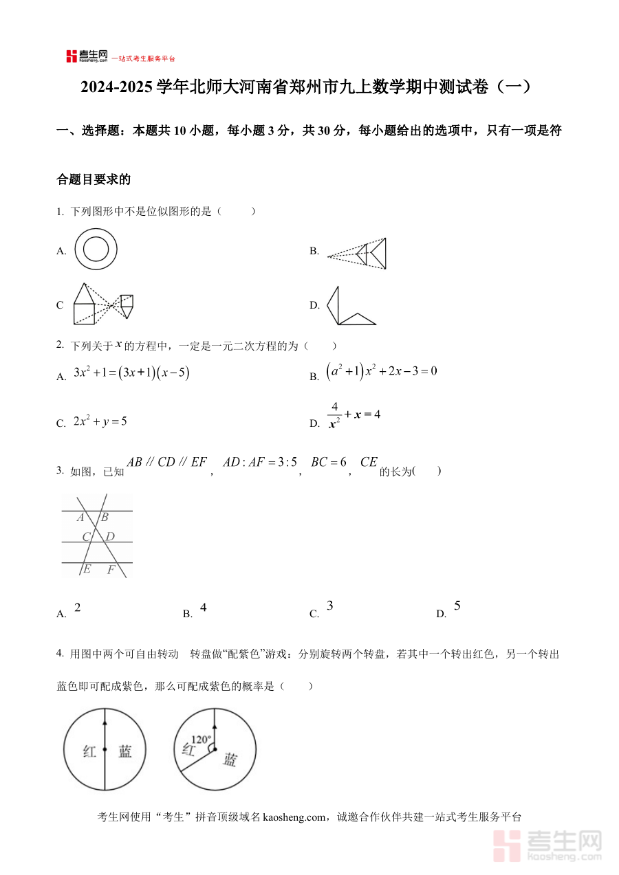 《精品解析:河南省郑州市2024-2025学年北师大版九年级上学期数学期中测试卷(一)(原卷版)》是针对河南省郑州市2024-2025学年使用北师大版教材的九年级上学期数学期中考试的备考资料,精准匹配该地区该学年的阶段考试需求,为相关使用者提供贴合本地教学实际的考试资源支撑。