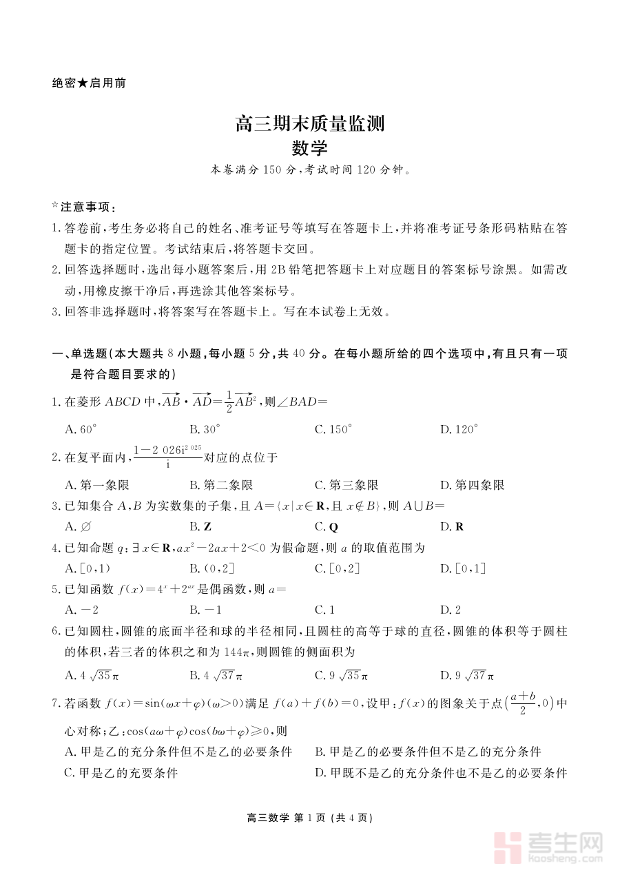 此资料适用于辽宁省2026届高三学生及数学教师群体,学生可通过其进行期末阶段的自我评估与复习巩固,教师可借助其分析学生群体的学习状况并优化教学方案,共同推动高三数学复习的精准化与高效化,为高考备考奠定坚实基础。