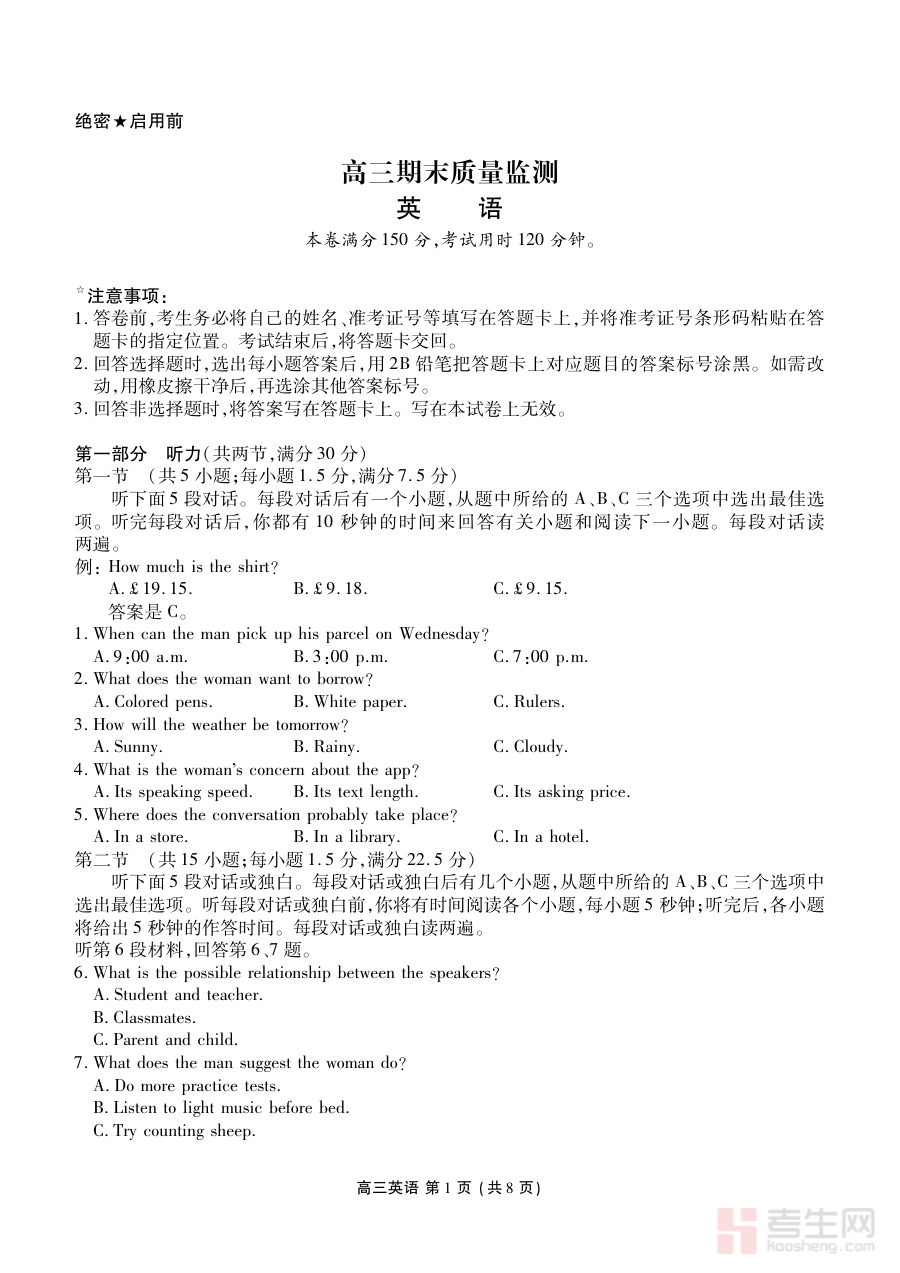 该资料主要用于高三学生在期末阶段进行英语学科的学情诊断与学习效果评估,帮助学生及时发现自身在英语学习中的优势与不足,为后续的备考规划提供数据支撑和方向指引。作为区域性联考的监测资料,它能够让学生了解同区域内其他考生的学习水平,明确自身定位,从而更有针对性地调整复习策略。同时,教师也可借助该资料的监测结果分析学生群体共性问题与个性化需求,优化教学计划,为学生提供更精准的辅导支持。