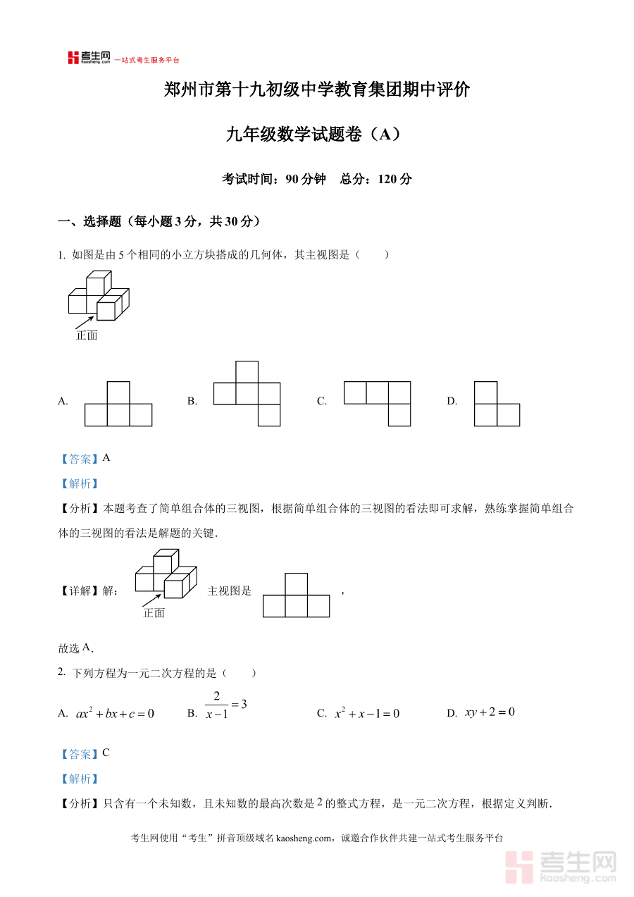 《精品解析:河南省郑州市第十九初级中学2024-2025学年上学期九年级数学期中试卷(A)(解析版)》是针对河南省郑州市第十九初级中学2024-2025学年第一学期九年级数学期中考试的配套备考资料,精准匹配该学段该学期的期中检测场景,为相关使用者提供具有明确针对性的内容支持。