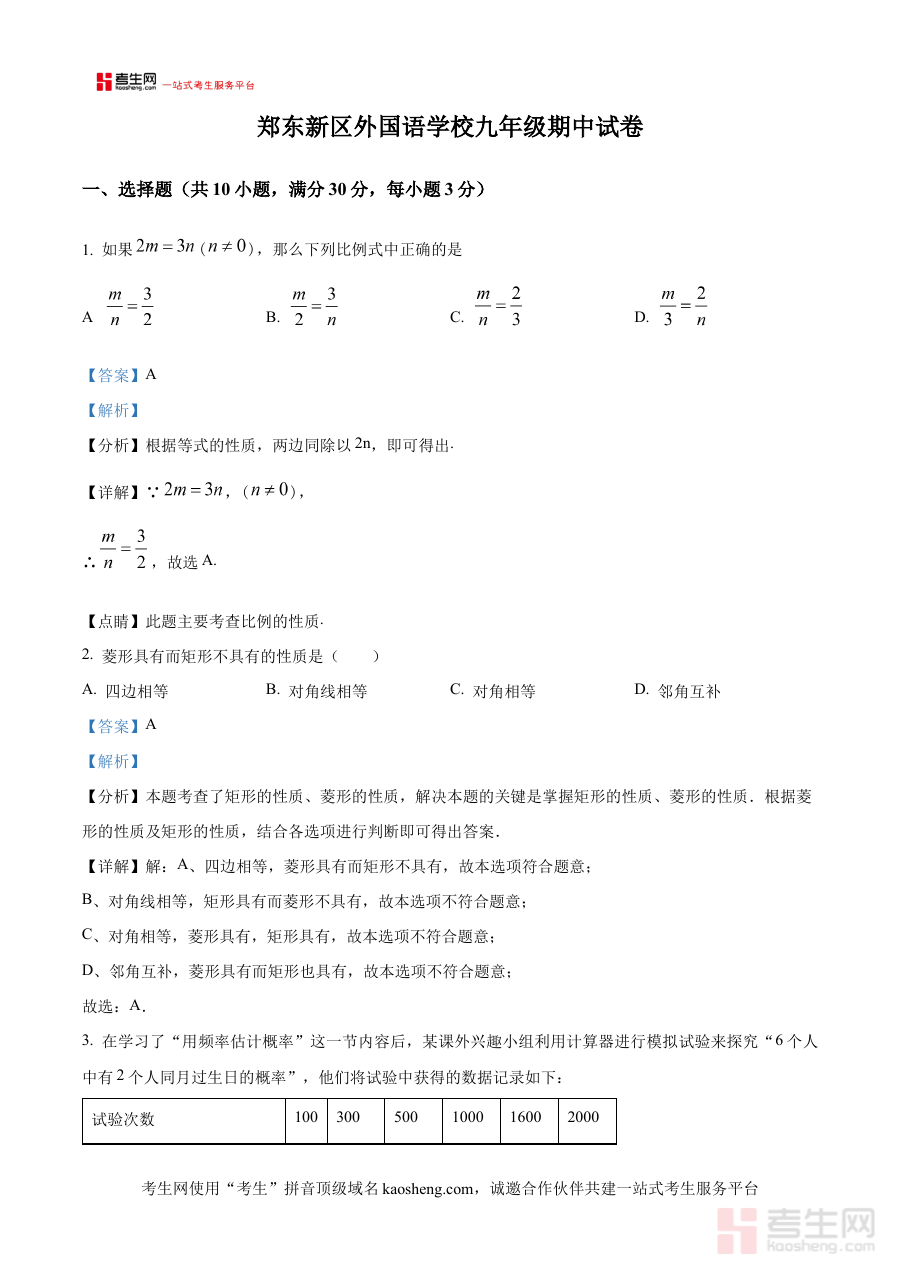 本资料适用于河南省郑州市郑东新区外国语学校九年级学生进行期中前的复习巩固与自我检测,也可为该校数学教师提供教学评估与命题参考,对其他希望了解同类学校期中数学考查特点的九年级学生及教师也具有参考价值,助力优化备考策略提升学习效果。