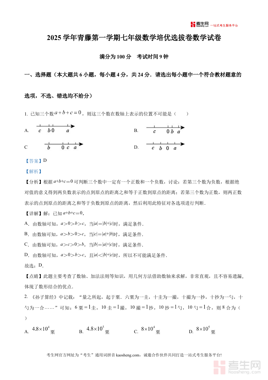 本资料主要适用于宁波大学青藤书院2025-2026学年七年级的学生,也可供该书院的数学教师用于教学分析或家长辅助孩子学习使用。它的价值在于通过对10月月考试卷的详细解析,助力学生巩固阶段所学知识、优化备考策略,同时为教师和家长提供了解学生学习状况的有效工具,推动后续学习的精准提升与个性化指导。