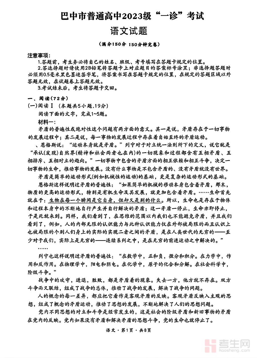 《巴中市普通高中2023级“一诊”考试语文》是针对四川省巴中市2023级普通高中学生的第一次诊断性考试语文科目的相关备考资料。该考试作为区域内高中阶段重要的阶段性检测之一,旨在通过标准化的测试形式,反映学生在高中学习进程中的语文知识掌握情况与能力发展水平。其设计与当地高中语文教学进度紧密结合,能够为后续的教学调整和学生备考提供基础参考依据。