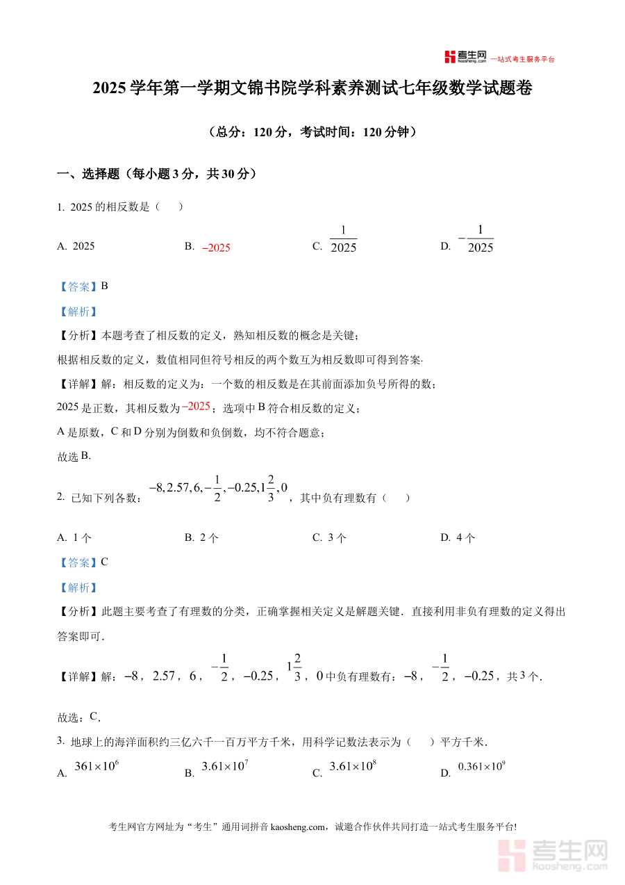 《精品解析:浙江省宁波市慈溪文锦书院2025-2026学年上学期七年级数学月考试卷(解析版)》是针对浙江省宁波市慈溪文锦书院特定学年学期的七年级数学阶段性考试的配套解析资料,聚焦该书院2025至2026学年上学期七年级学生的数学月度检测需求,为相关群体提供精准的考试内容解读与分析支持,是贴合该阶段数学学习进度的针对性备考资源。