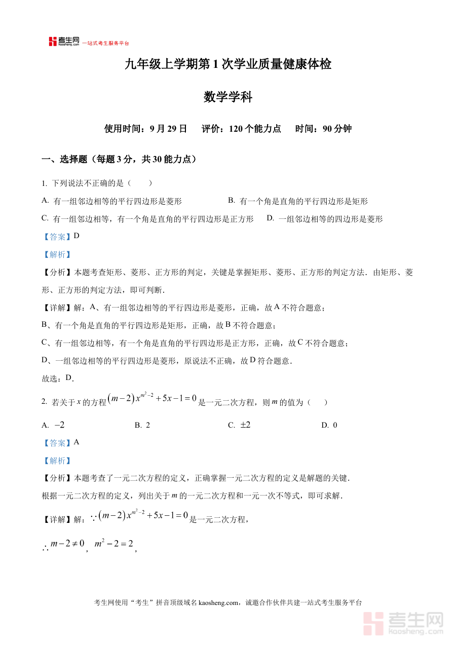 《精品解析:河南省郑州市二七区京广实验中学2025-2026学年九年级上学期9月月考数学试题(解析版)》是针对河南省郑州市二七区京广实验中学2025-2026学年九年级上学期9月数学月考的专业备考资料,聚焦该阶段学校内部阶段性数学检测需求,为使用者提供贴合本校考试方向的解析内容。