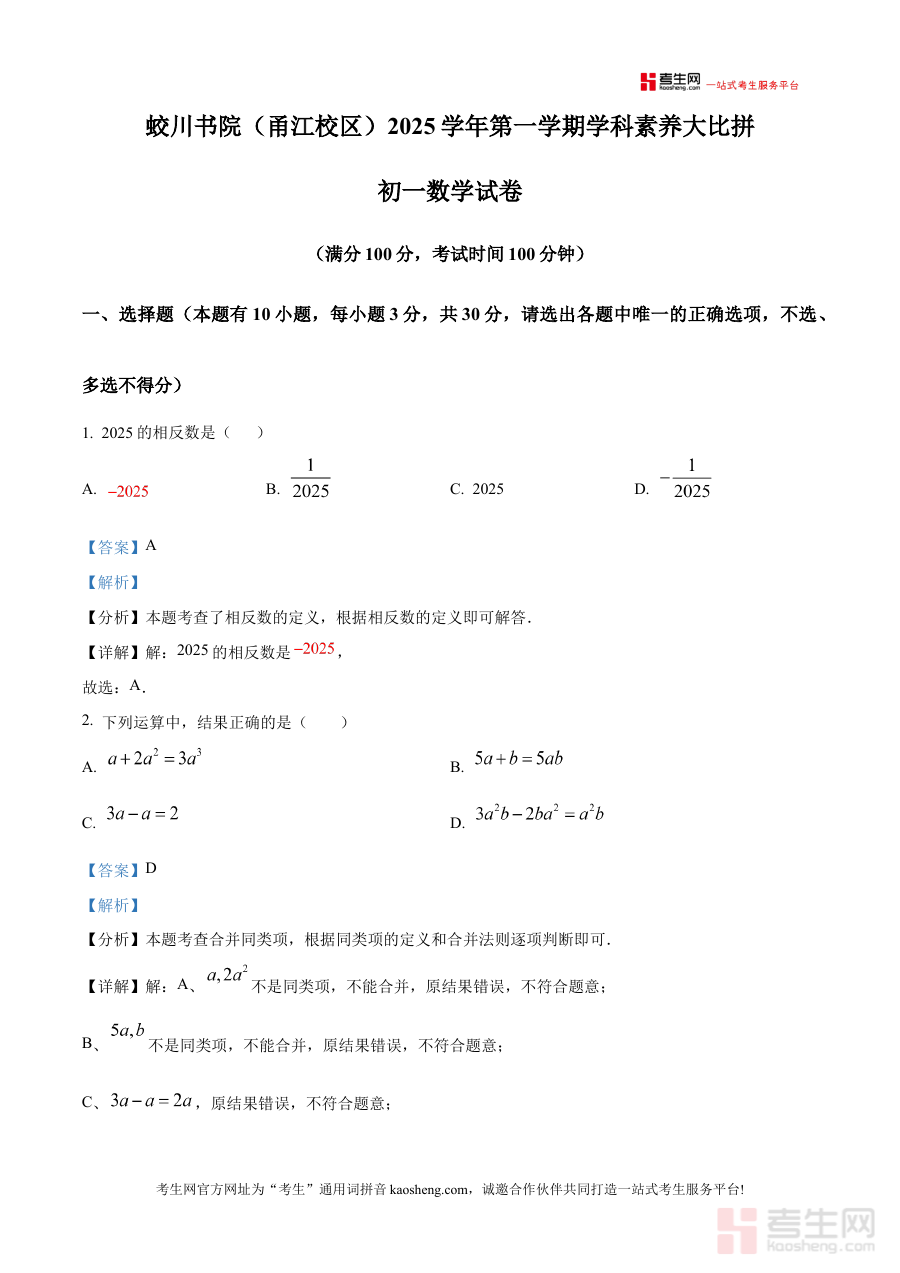 《精品解析:浙江省宁波市蛟川书院(甬真校区)2025-2026学年七年级上学期12月考数学试卷(学科素养大比拼)(解析版)》是针对浙江省宁波市蛟川书院甬真校区2025-2026学年七年级上学期12月举行的数学学科素养大比拼考试的备考资料。该资料聚焦特定校区的阶段性考试场景,结合当学期数学教学进度与学科素养培养目标,为相关师生提供具有针对性的解析支持。