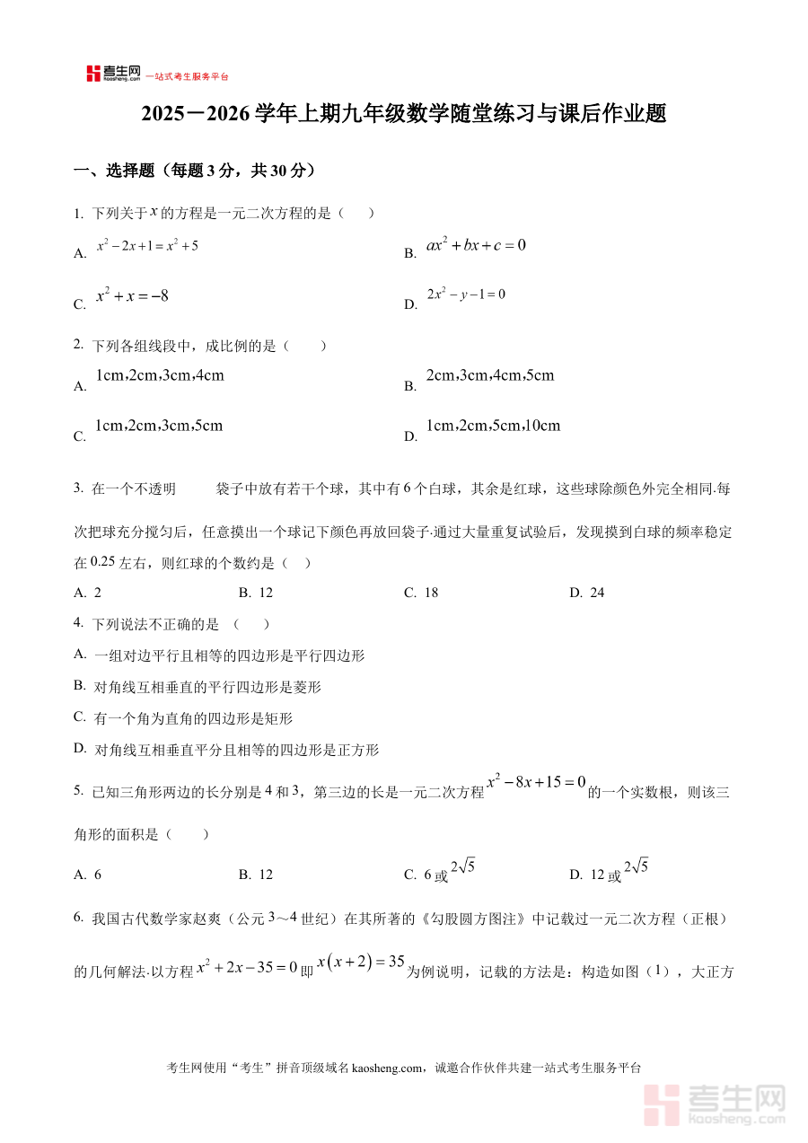 《精品解析:河南省郑州市枫杨外国语、朗悦慧外国语等五校联考2025-2026学年上学期九年级第一次月考数学试题 (原卷版)》是针对河南省郑州市枫杨外国语学校、朗悦慧外国语学校等五所学校联合组织的2025-2026学年上学期九年级第一次月考数学科目的原卷类备考资料,准确呈现该阶段区域联考的考试形式与命题方向。