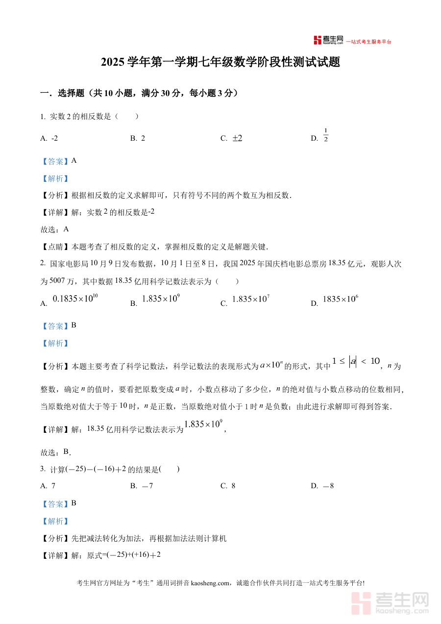 《精品解析:浙江省 宁波市曙光中学2025-2026学年上学期七年级期中数学卷(解析版)》是针对浙江省宁波市曙光中学2025至2026学年上学期七年级期中数学考试的备考资料,结合该阶段数学学习进度与学校考试要求编制而成,为相关使用者提供贴合实际的复习参考依据。