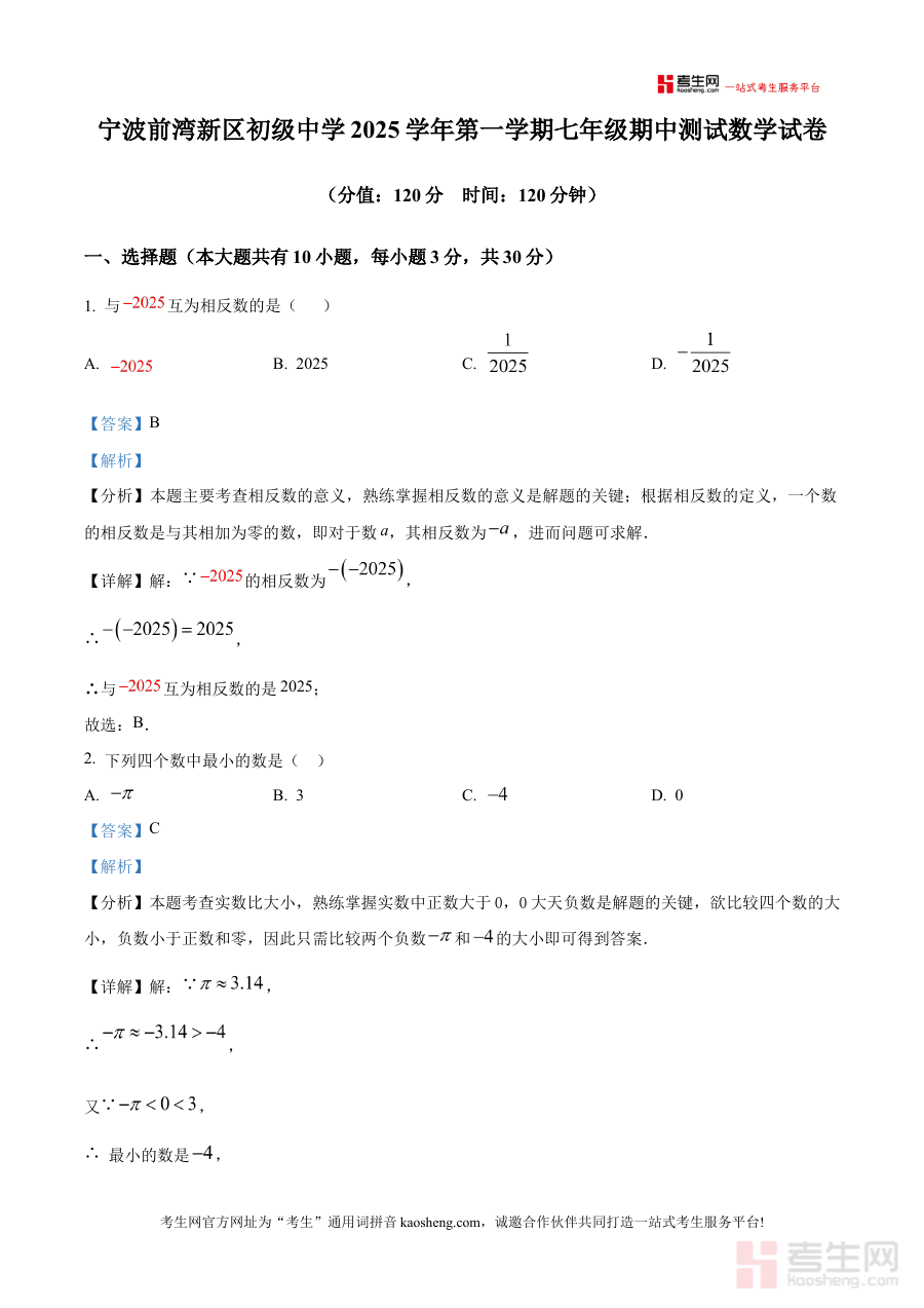 《精品解析:浙江省宁波市前湾新区初级中学2025--2026学年上学期七年级期中测试数学试题(解析版)》是针对浙江省宁波市前湾新区初级中学2025至2026学年上学期七年级期中数学测试的备考资料,聚焦该阶段的期中检测场景,为相关师生提供专业的解析支持。