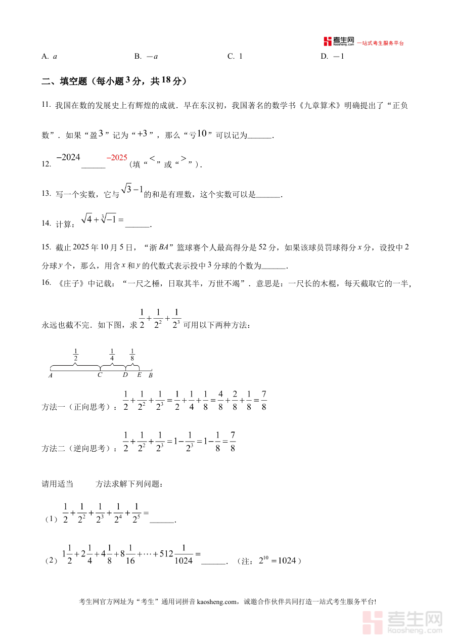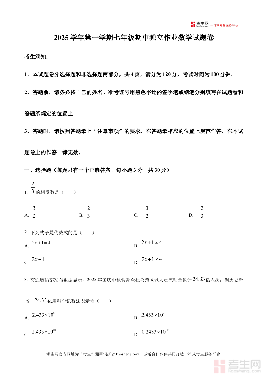 《精品解析:浙江省宁波市宁海县2025-2026学年七年级上学期期中数学试卷(原卷版)》是针对浙江省宁波市宁海县区域内2025-2026学年七年级学生上学期期中数学考试的官方原卷类备考资料。它精准匹配该地区该学年七年级数学学科的期中阶段检测需求,能够帮助使用者直观了解当地期中数学考试的命题框架与试卷结构,为后续的备考准备提供真实且贴合本地实际的试卷参考依据。此资料的原卷属性确保了其与当地期中考试的高度一致性,是学生和教师获取第一手考试信息的重要渠道。