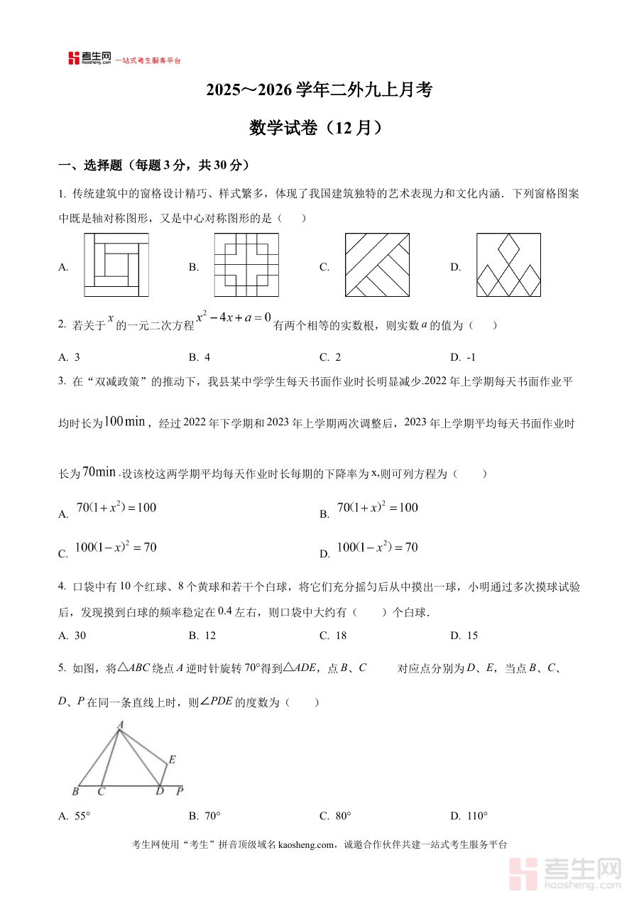 《精品解析:河南省郑州市第二外国语中学2025-2026学年上学期九年级12月月考数学试卷(原卷版)》是一份聚焦特定区域特定学段的数学阶段性检测资料,其包含的核心元信息有河南省郑州市第二外国语中学这一具体学校主体、2025-2026学年上学期的时间维度、九年级学生群体以及12月月考这一阶段性考试类型,属于能够直接呈现该次考试原始面貌的备考资源。