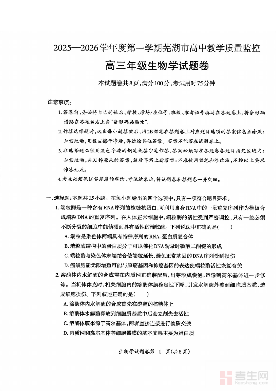 《高考备考资料_生物试题》是针对高考生物学科设计的专业备考资料,聚焦于高考生物考试的核心考查方向,涵盖了高考生物所需的关键知识领域,为考生搭建起与高考要求相匹配的练习场景。作为高考生物备考体系中的重要辅助资源,该资料旨在帮助考生熟悉高考生物考试的整体框架与考查逻辑,为后续的系统复习与针对性提升奠定坚实基础。