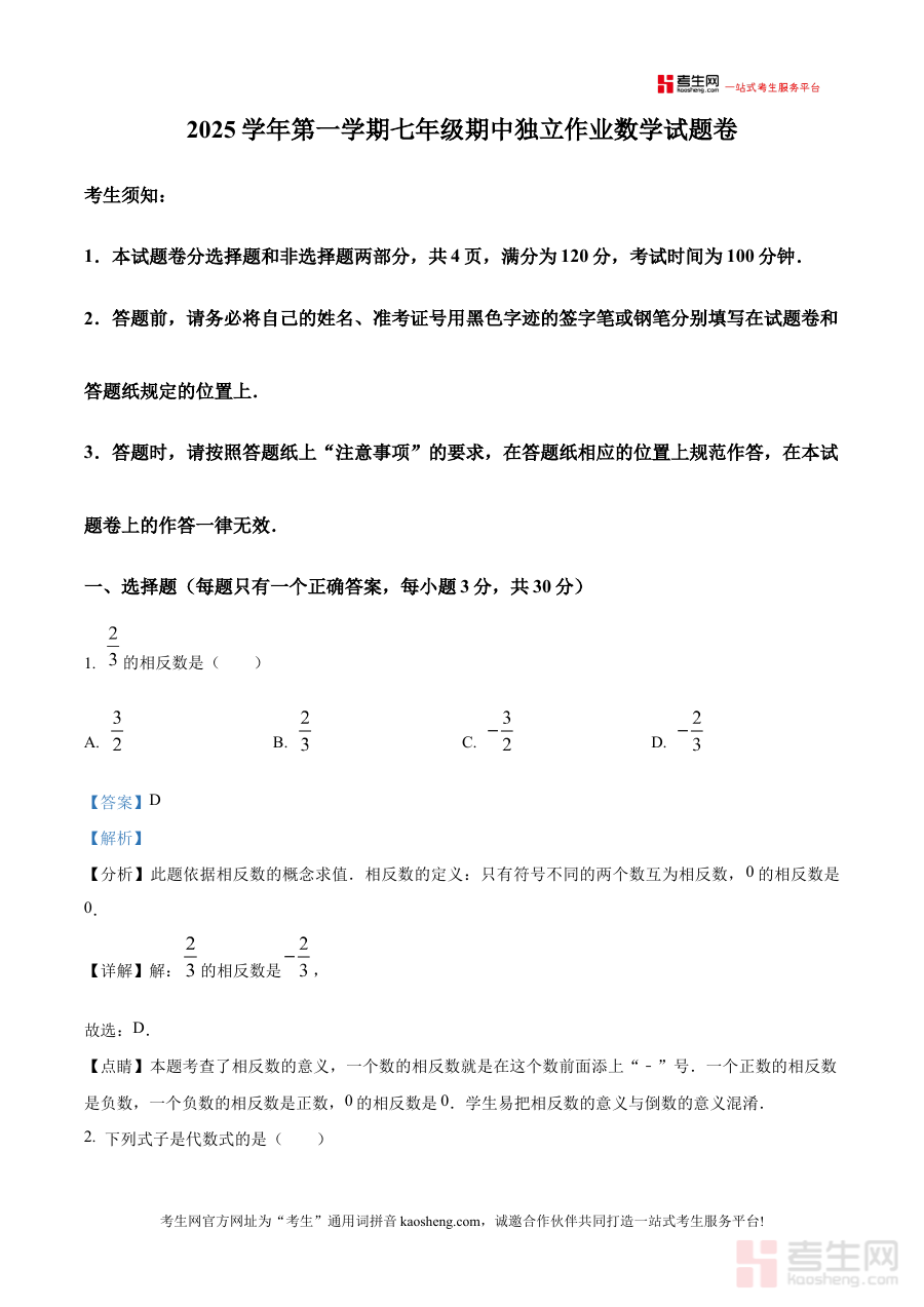 《精品解析:浙江省宁波市宁海县2025-2026学年七年级上学期期中数学试卷(解析版)》是针对浙江省宁波市宁海县2025至2026学年七年级上学期期中数学考试的专业备考资料,聚焦该地区该阶段数学学科的期中检测需求,为使用者提供与本地教学进度和考试要求相匹配的资源支持。