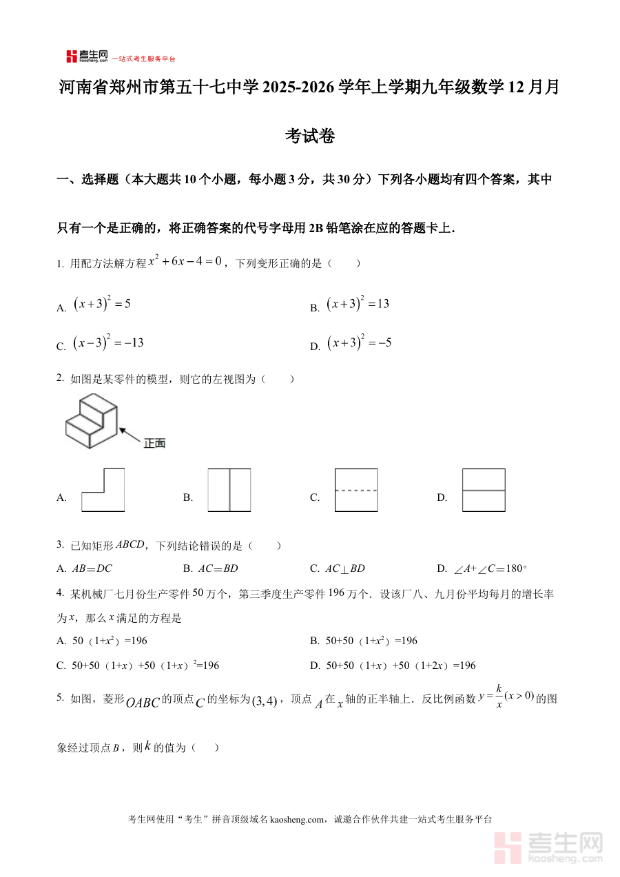 《精品解析:河南省郑州市第五十七中学2025-2026学年上学期九年级数学12月月考试卷(原卷版)》是针对河南省郑州市第五十七中学2025-2026学年上学期九年级数学学科12月月度检测的专用备考资料,精准匹配该校该学年该阶段的数学学习进度与检测需求。