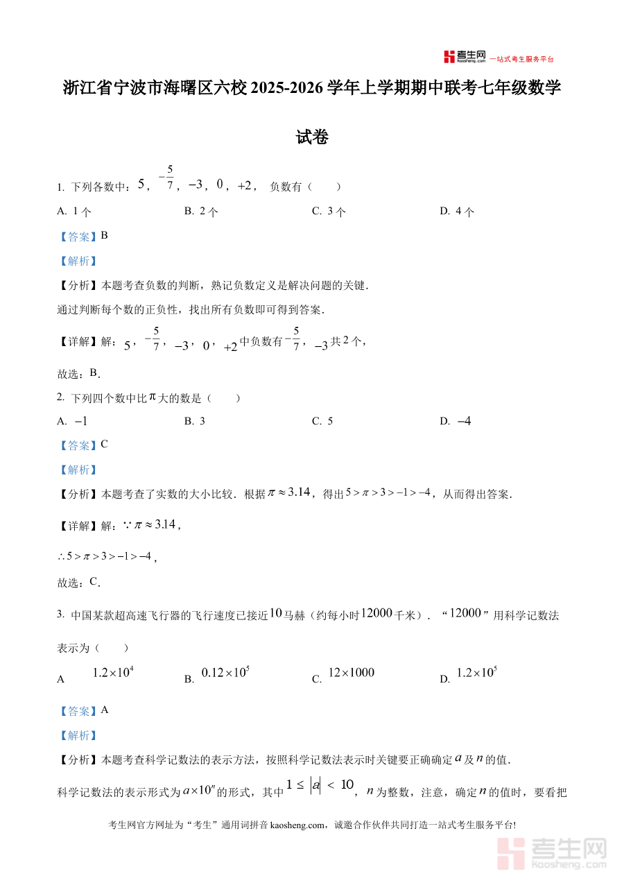 《精品解析:浙江省宁波市海曙区六校2025-2026学年上学期期中联考七年级数学试卷(解析版)》是专门针对浙江省宁波市海曙区六所学校联合组织的2025至2026学年第一学期七年级数学期中联考精心编制的配套解析资料,属于区域校际联考场景下的针对性备考资源,能够精准匹配该阶段七年级学生的数学学习进度与此次联考的考查方向,为使用者提供贴合实际需求的学习支持。