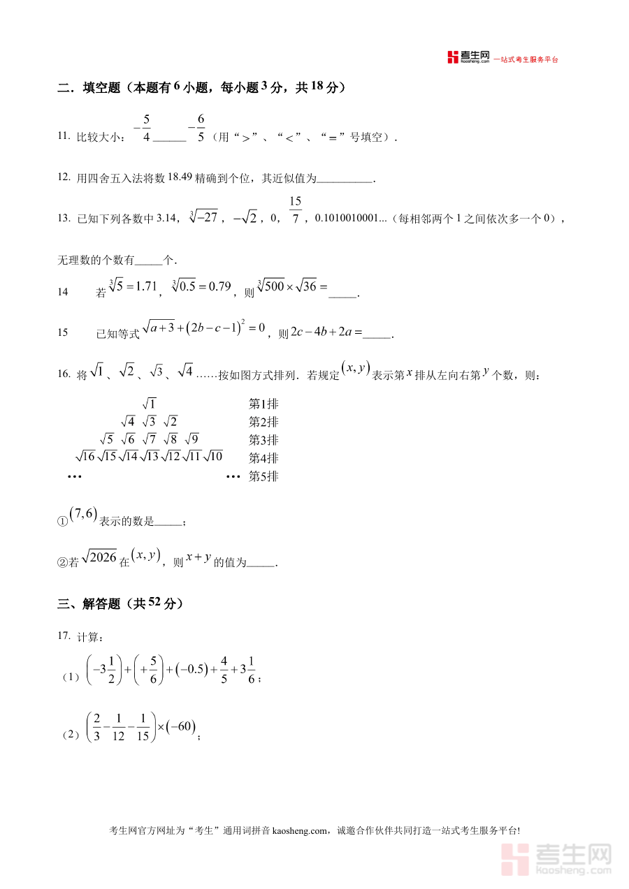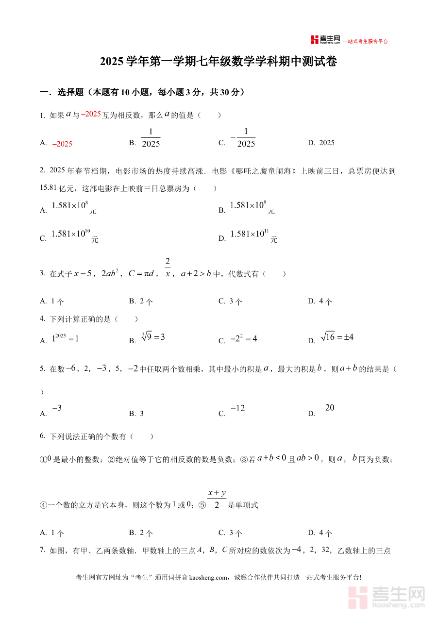 《精品解析:浙江省宁波市鄞州实验中学2025-2026学年七年级上学期期中数学卷(原卷版)》是针对2025-2026学年浙江省宁波市鄞州实验中学七年级上学期期中数学考试编制的专业备考资料。该资料严格保留了期中数学考试原卷的呈现形式,能够真实反映该学校七年级上学期期中数学考试的考查框架、命题风格及题型分布特点,为使用者提供贴近实际考试场景的参考依据,帮助其提前熟悉考试的整体结构与要求。