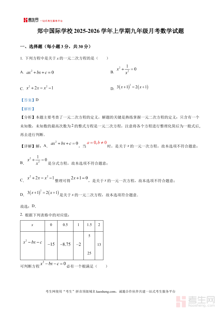 《精品解析:河南省郑州市郑中国际学校2025-2026学年上学期九年级第一次月考数学试题(解析版)》是针对河南省郑州市郑中国际学校2025-2026学年上学期九年级第一次月考数学科目的专业备考资料,结合该阶段考试的时间节点与目标定位,为使用者提供对应考试的针对性支持。