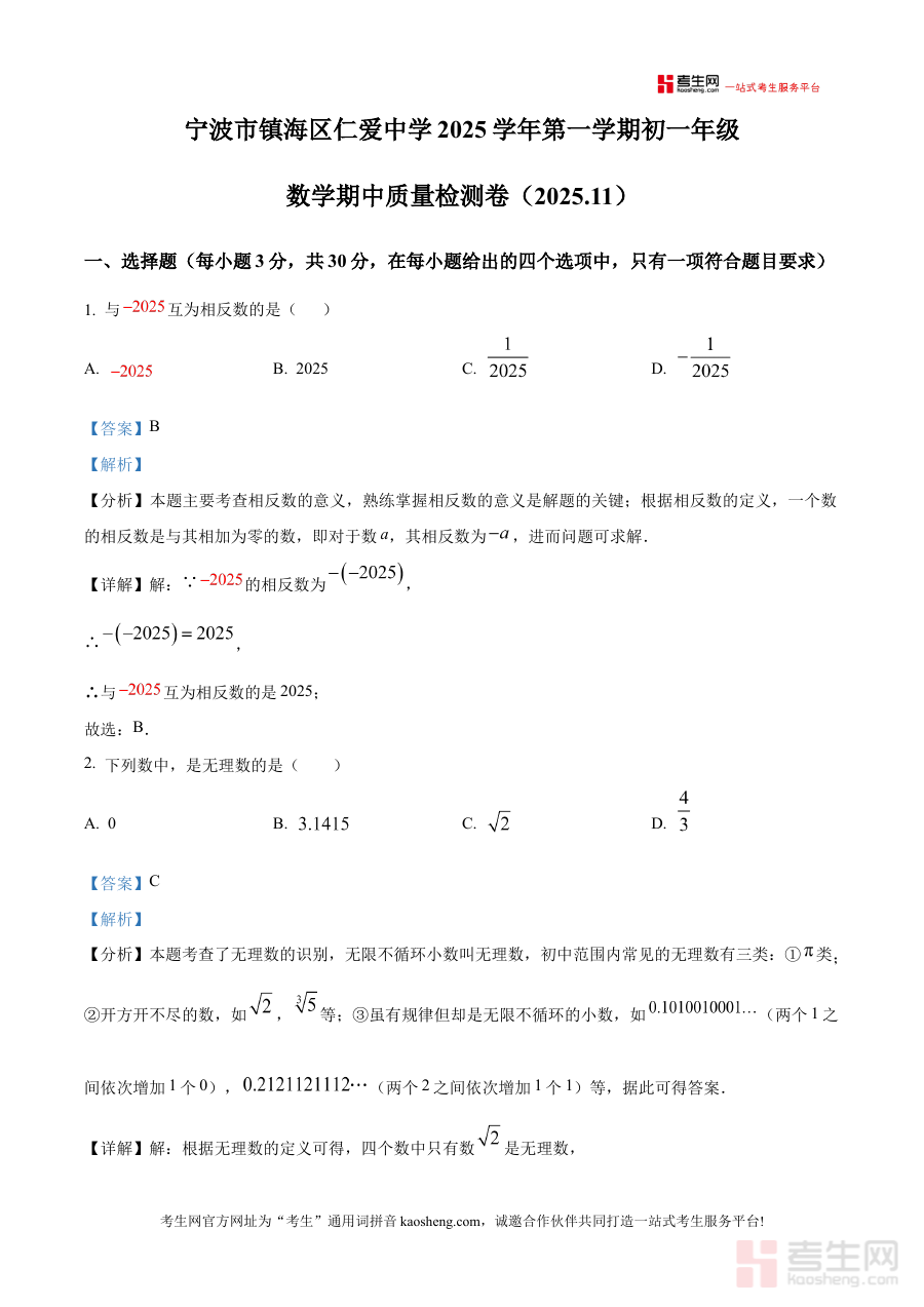 《精品解析:浙江省宁波市镇海区仁爱中学2025-2026学年七年级上学期期中数学试卷(解析版)》是针对浙江省宁波市镇海区仁爱中学2025-2026学年七年级上学期期中数学考试编写的专业备考资料,精准匹配本校该阶段期中数学考试的考查范围和要求,包含考试相关内容及详细解析,为学生提供与本校期中数学考试直接对应的复习参考依据。