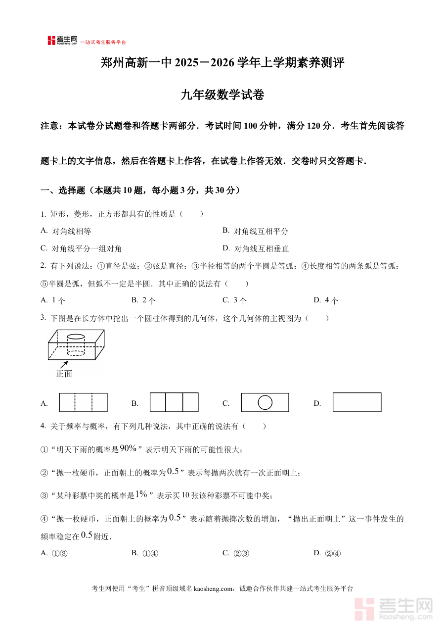 《精品解析:河南省郑州市高新区第一中学2025-2026学年上学期九年级第二次月考数学试卷(原卷版)》是针对河南省郑州市高新区第一中学2025-2026学年上学期九年级学生第二次月考数学科目的原卷版备考资料,精准匹配该学校该阶段的数学教学进度与考试要求,为相关群体提供贴合实际的考试参考依据。