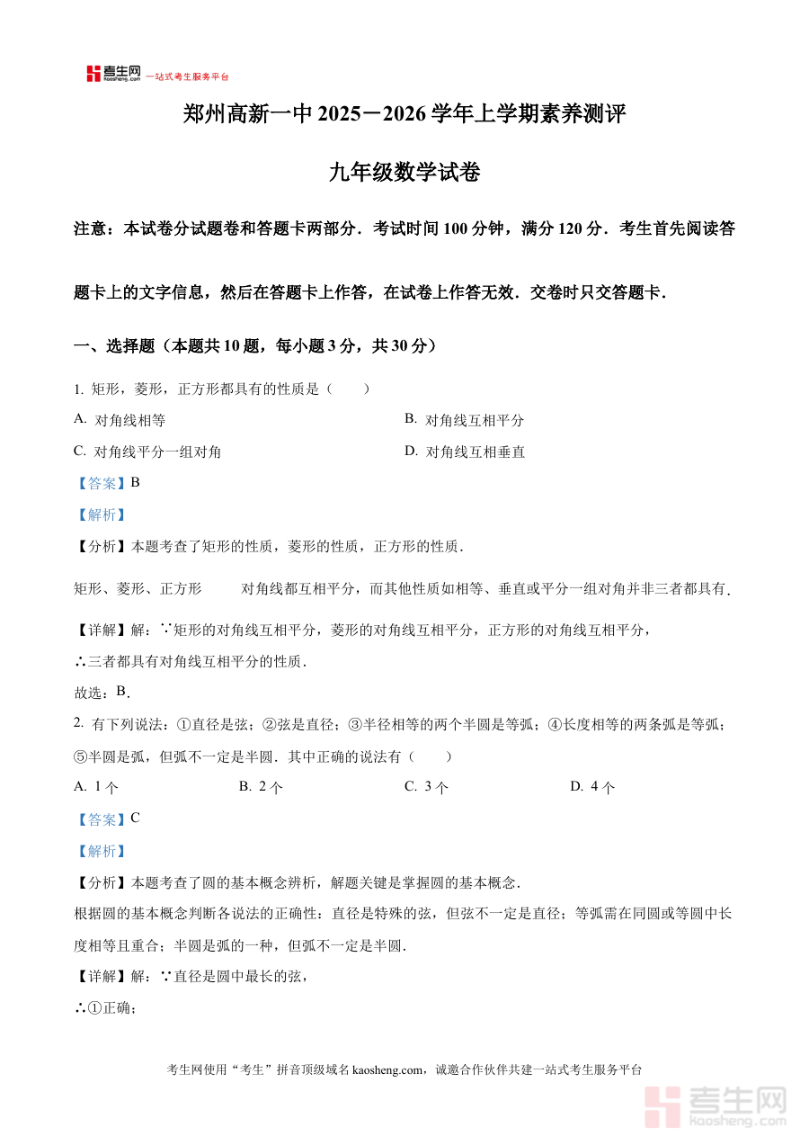 《精品解析:河南省郑州市高新区第一中学2025-2026学年上学期九年级第二次月考数学试卷(解析版)》是针对河南省郑州市高新区第一中学2025-2026学年上学期九年级第二次月考数学科目的备考资料,聚焦该阶段数学学习的核心目标与考试要求,为使用者提供与实际考试场景高度匹配的解析支持。