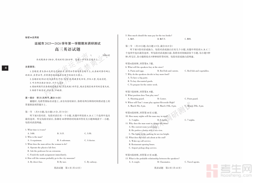《运城市2025—2026学年第一学期期末调研测试 高三英语》是针对山西省运城市2025至2026学年第一学期高三年级学生的英语学科期末调研测试相关备考资料,该测试属于区域性阶段性学业质量监测类考试,旨在反映高三学生本学期英语学习的知识掌握程度与能力发展状态。