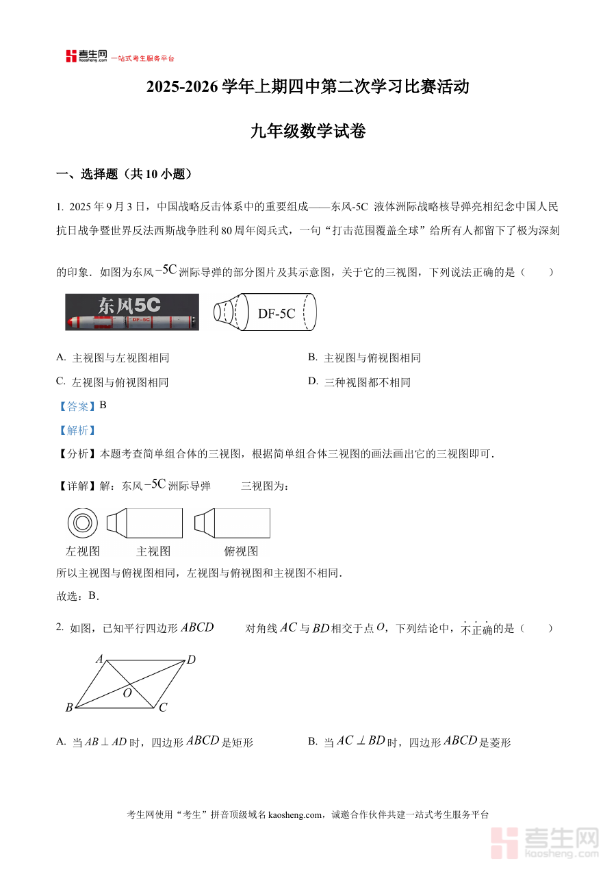 《精品解析:河南省郑州经济技术开发区第四中学2025-2026学年上学期第二次学习比赛活动九年级数学试卷(解析版)》是针对河南省郑州经济技术开发区第四中学2025-2026学年上学期九年级数学学科第二次学习比赛活动的专项备考资料,紧密贴合该阶段学习比赛的考查方向与要求编制而成。