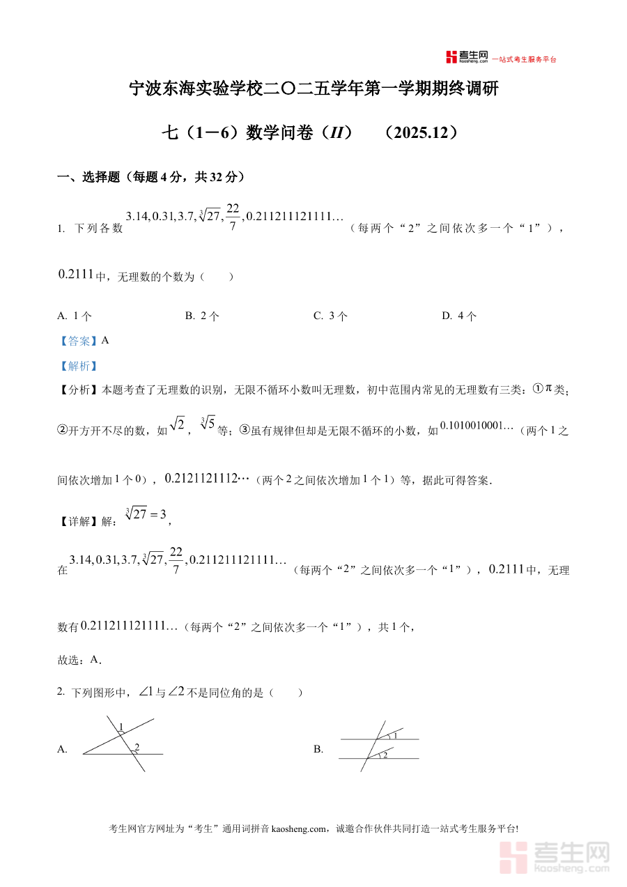 《精品解析:浙江省宁波东海实验学校2025--2026学年上学期期末调研七年级数学试卷(解析版)》是针对浙江省宁波市东海实验学校2025-2026学年上学期七年级数学期末调研考试的配套备考资料。该资料聚焦于该学校特定学年学期的期末调研场景,为相关使用者提供与考试直接关联的解析内容支撑。