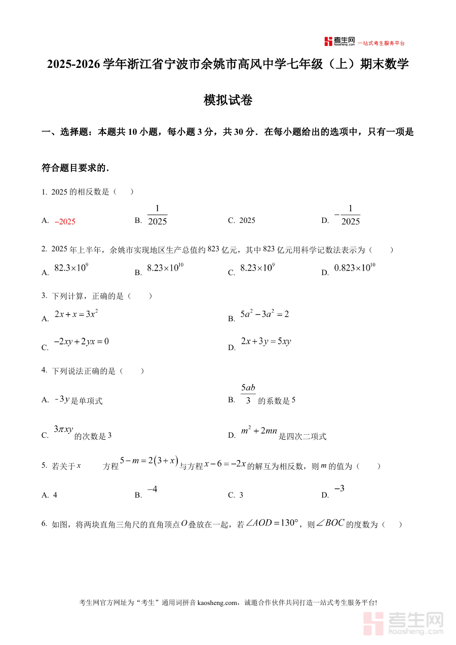 《精品解析:浙江省宁波市余姚市高风中学2025-2026学年七年级上学期期末数学模拟试卷(原卷版)》是针对浙江省宁波市余姚市高风中学2025-2026学年七年级上学期期末数学考试开发的模拟备考资料,结合该区域七年级数学教学进度与期末考核方向,为师生提供贴合本地学情的练习资源。