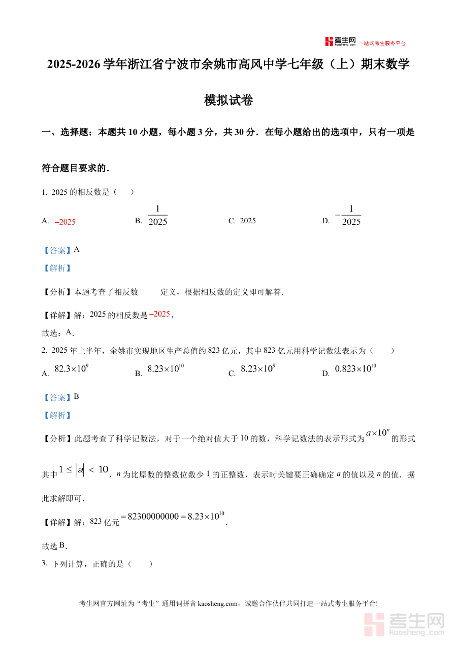 其适用人群为浙江省宁波市余姚市高风中学2025-2026学年七年级学生、该学校的数学教师及学生家长,通过解析版的内容呈现,能让使用者更清晰地理解解题思路与方法,提升阶段检测与备考规划的有效性,助力学生在期末数学考试中做好充分准备。