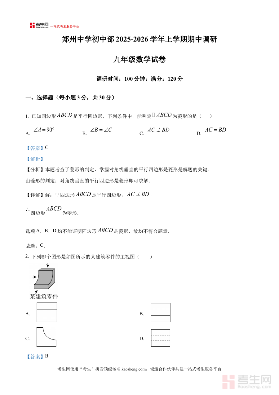 《精品解析:河南省郑州中学初中部2025-2026学年九年级上学期期中调研数学试卷(解析版)》是针对河南省郑州中学初中部2025-2026学年九年级上学期期中调研考试的数学学科备考资料,精准匹配该阶段数学学科的期中调研场景,为相关使用者提供专业的考试内容解析支持。