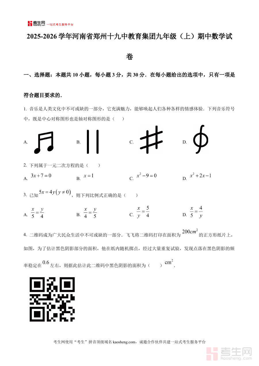 《精品解析:河南省郑州十九中教育集团2025-2026学年九年级上学期期中数学试卷(原卷版)》是针对河南省郑州十九中教育集团范围内2025-2026学年九年级上学期期中数学考试的配套备考资料,它依托该教育集团的期中检测体系,精准匹配该阶段数学学科的教学进度与考试要求,为使用者提供贴合本地校际联考标准的原卷呈现形式。