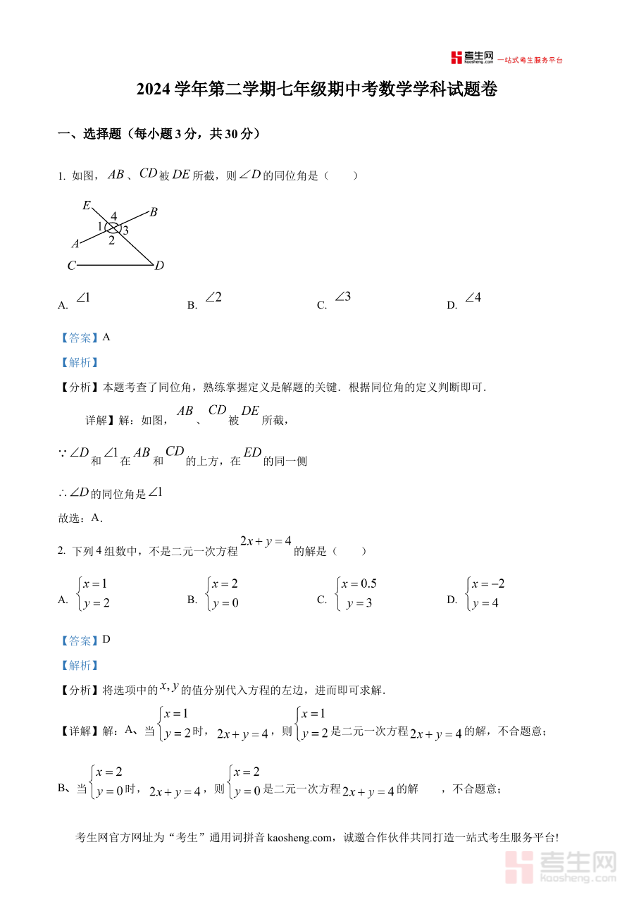 《精品解析:浙江省宁波市余姚市城区初中 2024-2025学年七年级下学期4月期中数学试题(解析版)》是针对浙江省宁波市余姚市城区初中2024-2025学年七年级下学期4月期中考试的数学学科备考资料,聚焦该地区初中阶段特定学期的期中检测需求,为相关教学与学习场景提供专业的解析类支持。