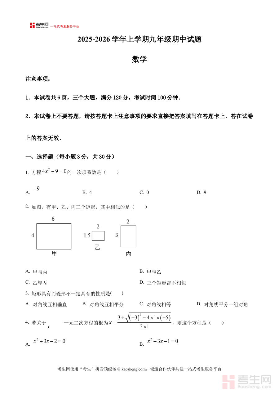 《精品解析:河南省郑州市2025-2026学年九年级上学期期中九校联考数学试卷(原卷版)》是针对河南省郑州市2025-2026学年九年级上学期期中阶段九校联合考试数学科目的备考资料,它精准对应该学年该学期的期中联考时间节点与区域教学实际,为使用者提供了贴合本地联考要求的原卷形式资源,有助于使用者直观了解此次联考的考试框架与基本设置,是适配区域教学进度与联考标准的针对性资料。