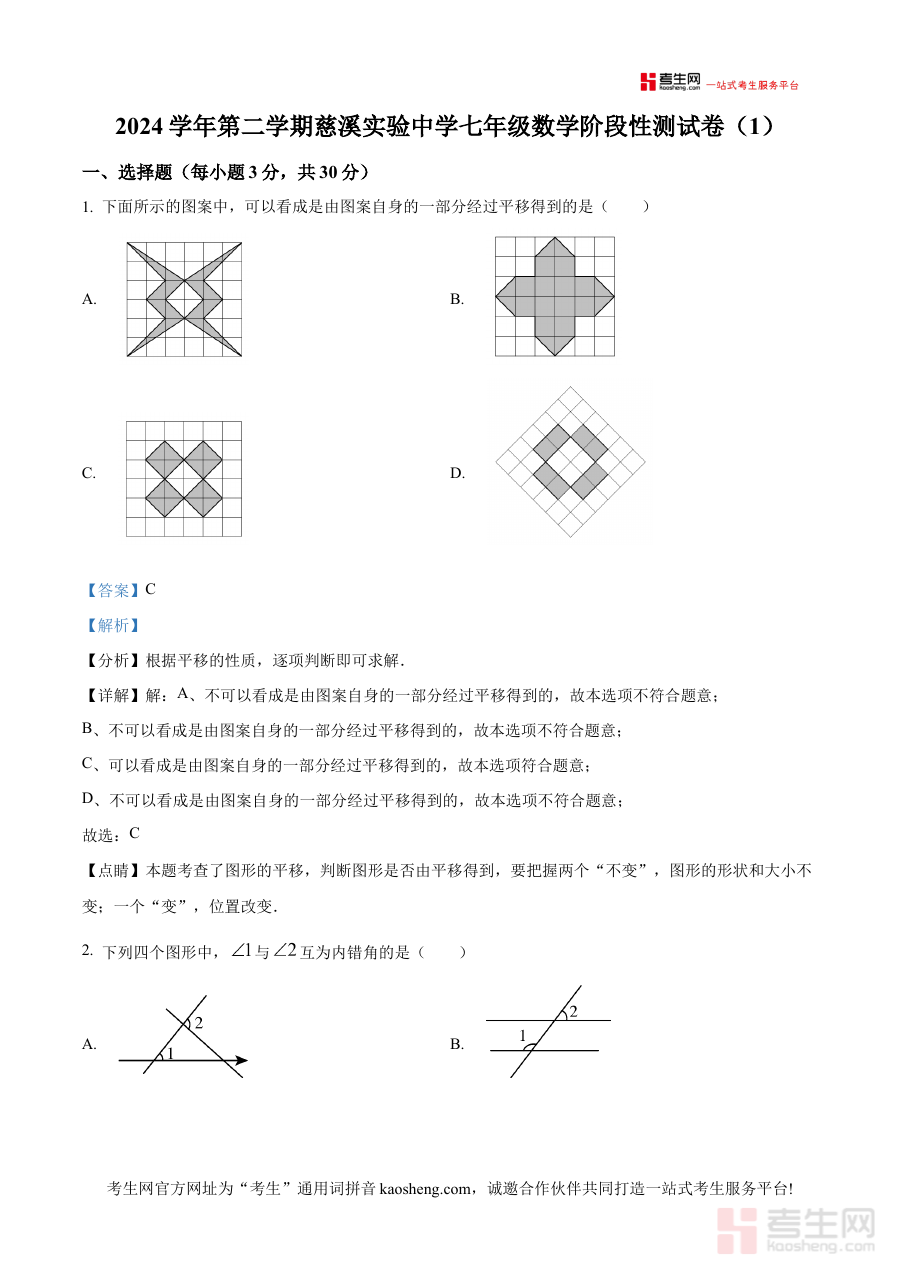 此资料适用人群主要为浙江省宁波市慈溪实验中学2024-2025学年下学期的七年级学生及该年级数学教师。对于学生而言,它可作为自主复习与备考规划的重要工具,助力其在月考前做好知识巩固与应试准备;对于教师而言,则能通过解析内容更精准把握学生学习状态,为后续教学中的学情诊断与针对性辅导提供支持,提升阶段教学的有效性。