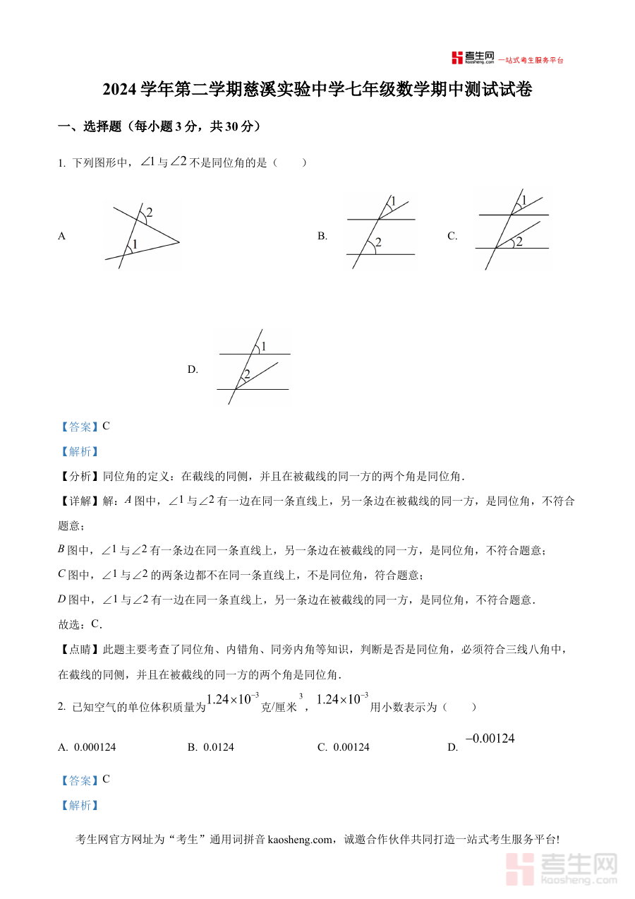 《精品解析:浙江省宁波市慈溪实验中学2024-2025学年七年级下学期数学期中试卷(解析版)》是针对浙江省宁波市慈溪实验中学2024至2025学年七年级下学期数学期中考试开发的备考资料,聚焦该学年该阶段数学学科的期中检测场景,为相关使用者提供与本次考试直接对应的参考资源。