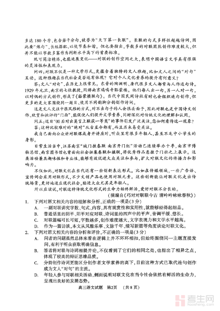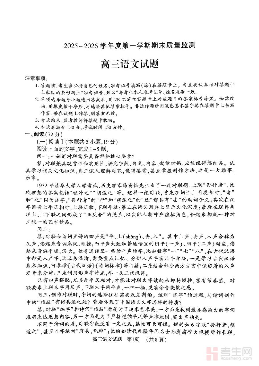 《2025-2026学年度第一学期期末质量监测高三语文试题及答案解析 2025-2026学年度第一学期期末质量监测高三语文试题》是针对2025-2026学年第一学期高三语文期末质量监测的专用备考资料,涵盖试题与答案解析两个核心模块。该资料严格贴合当期教学进度与期末检测标准,为使用者提供与高三语文期末质量监测相匹配的参考内容,助力把握考情方向。