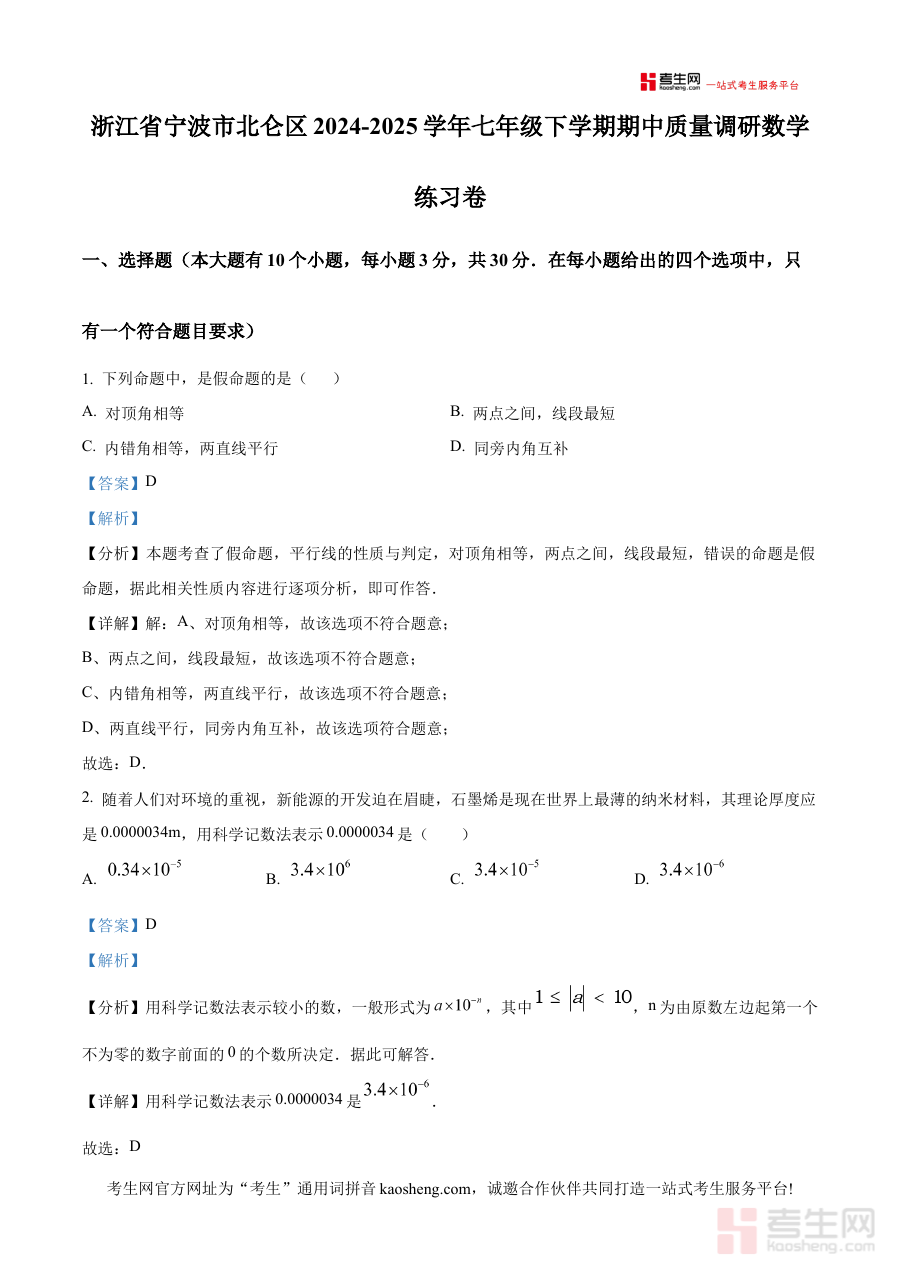 《精品解析:浙江省宁波市北仑区2024-2025学年七年级下学期期中质量调研数学练习卷(解析版)》是针对浙江省宁波市北仑区2024-2025学年七年级下学期期中质量调研考试设计的数学备考资料,聚焦该地区该学年七年级下学期期中阶段的数学学习成果检测需求。