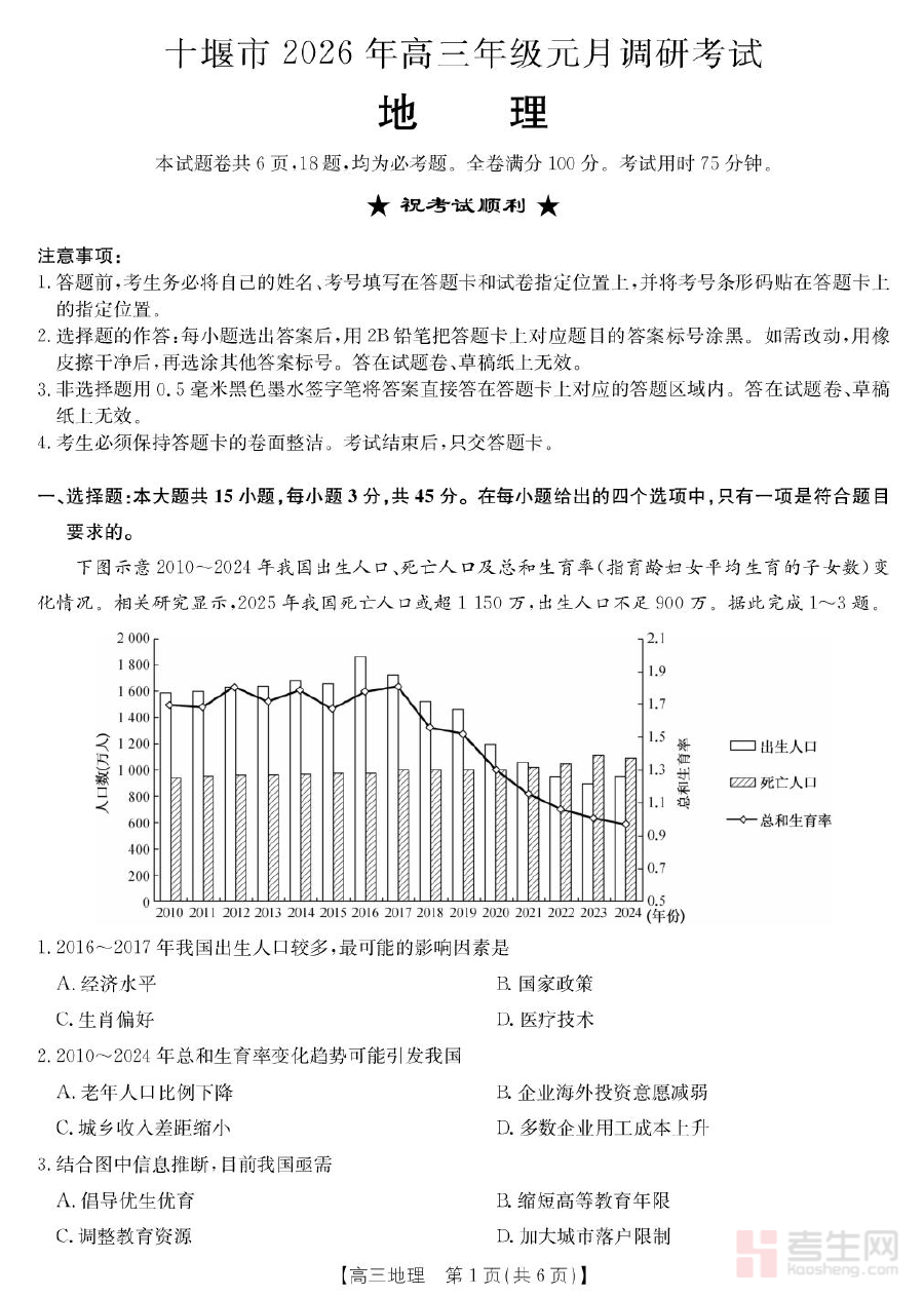 《2026届湖北省十堰市高三年级元月调研考试一模测试地理试题》是面向2026届湖北省十堰市高三学生的地理学科阶段性考试资料,属于本地高三元月调研考试体系中的一模测试环节,旨在为学生提供符合区域教学要求与考试标准的备考资源支撑。