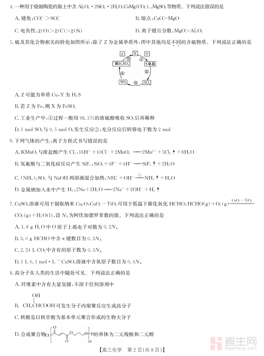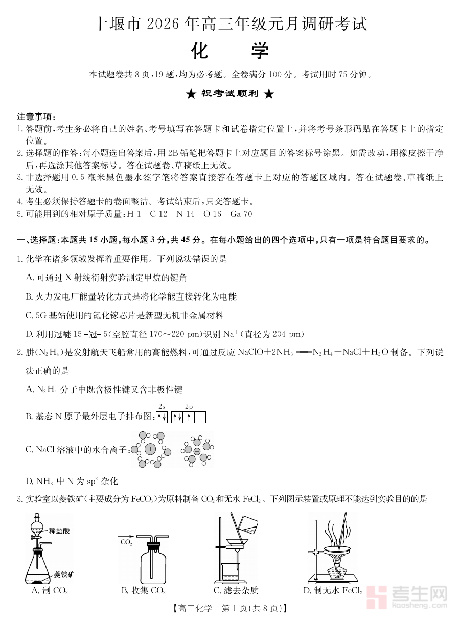 该试卷适用于湖北省十堰市2026届高三全体学生及相关化学教师群体。对于学生来说,参与此次调研考试是检验阶段性复习成效、定位学习短板的重要途径;对于教师而言,利用试卷结果开展教学反思与指导优化,能有效增强教学的精准性与有效性。其作为阶段性检测与备考规划的关键依据,对提升高三化学复习效率与教学质量具有重要价值,是高三化学学习过程中不可或缺的参考资料。