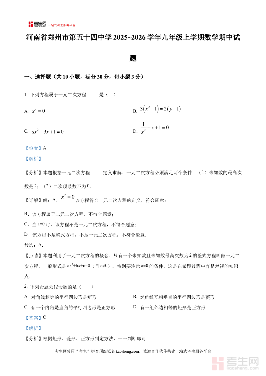 《精品解析:河南省郑州市第五十四中学2025~2026学年九年级上学期数学期中试题 (解析版)》是针对河南省郑州市第五十四中学2025至2026学年九年级学生上学期数学期中考试设计的专属备考资料。该资料紧密贴合学校当学期的教学进度与期中检测标准,聚焦九年级上学期数学学科的阶段性知识体系,为学生提供与校考实际高度匹配的练习素材及专业解析支持。