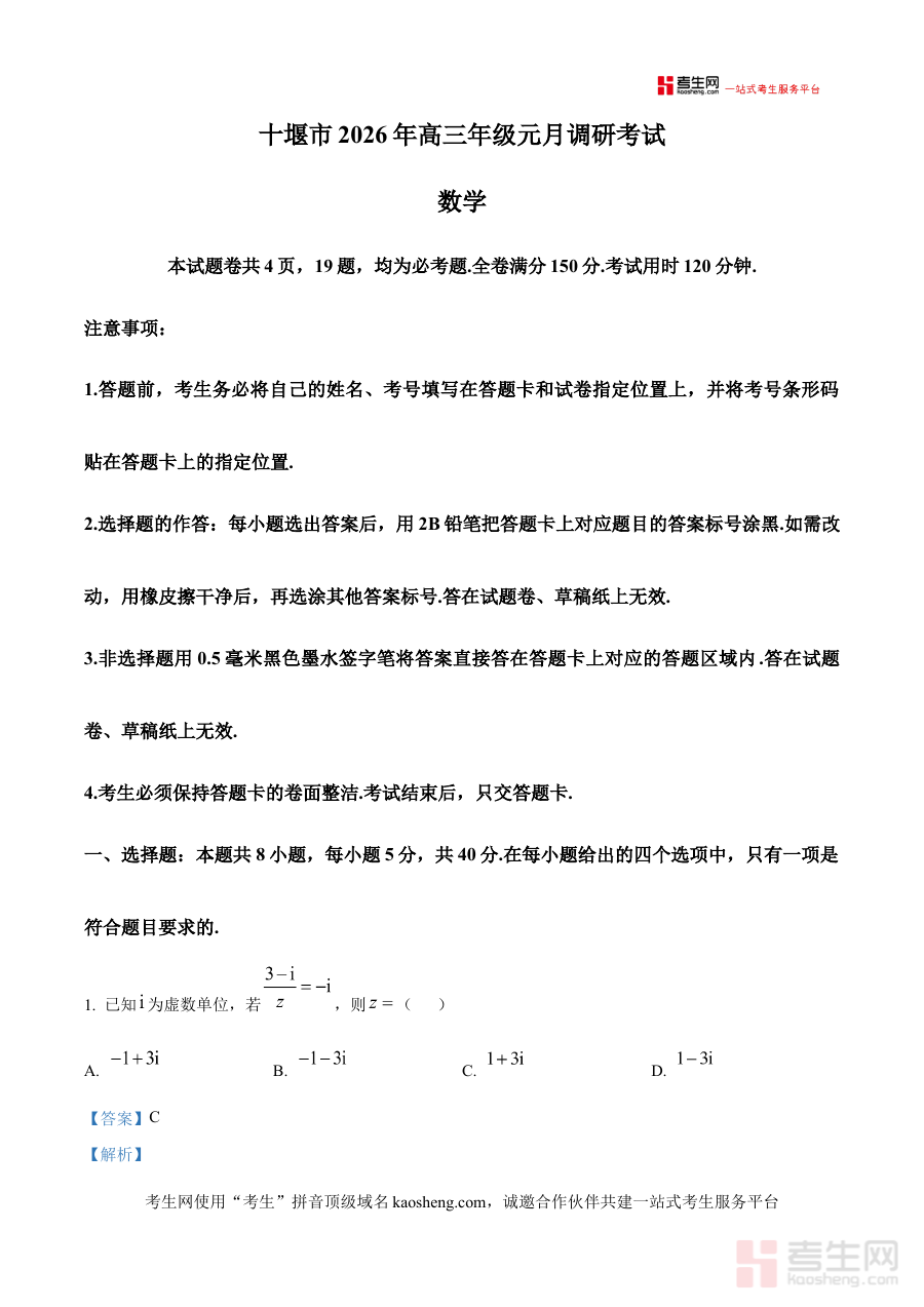 《精品解析:十堰市2026届高三上学期元月调研考试数学试题(解析版)》是针对湖北省十堰市2026届高三学生在高中三年级上学期元月举行的调研考试数学科目的解析类备考资料。该资料围绕此次区域性调研考试的数学试题展开专业解析,为考生提供精准的学习支持,助力其把握考试的核心方向与要求。