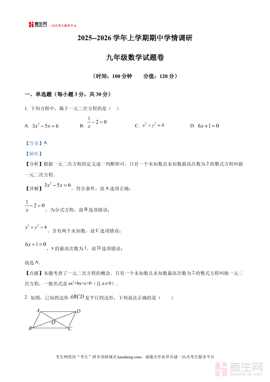 《精品解析:河南省郑州市郑东新区玉溪初级中学2025-2026学年九年级上学期10月期中考试数学试题(解析版)》是针对河南省郑州市郑东新区玉溪初级中学特定学年与学期的数学学科阶段性考试备考资料。其核心定位为该中学2025-2026学年九年级上学期10月期中考试的配套解析资源,贴合该校该阶段的教学进度与考试要求,为相关使用者提供精准适配的参考内容。