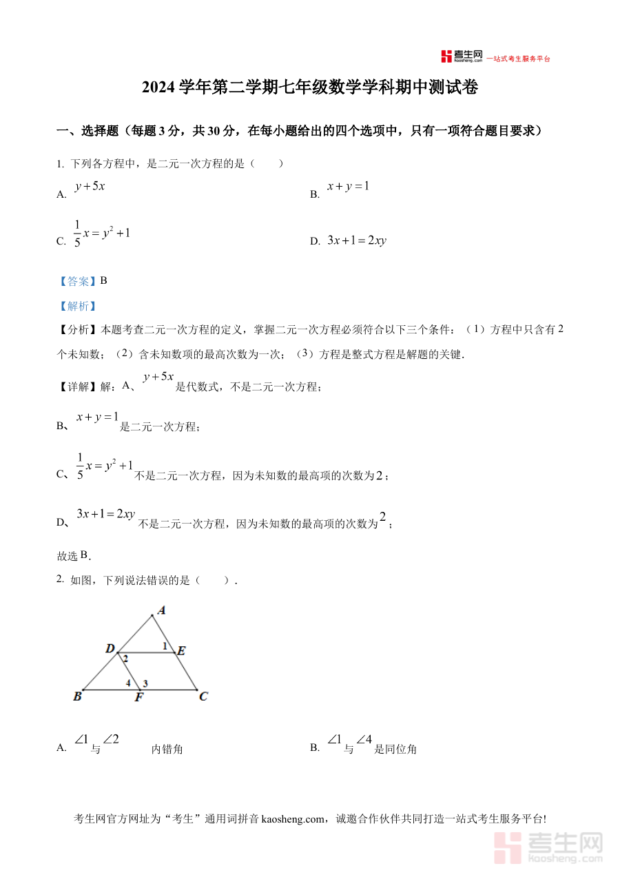 本资料适用于参与此次联考的七年级学生及相关教学人员,对学生而言,有助于增强期中备考的针对性与有效性;对教师而言,可作为教学评估与指导学生备考的实用资源,助力实现阶段检测与备考规划的协同推进。
