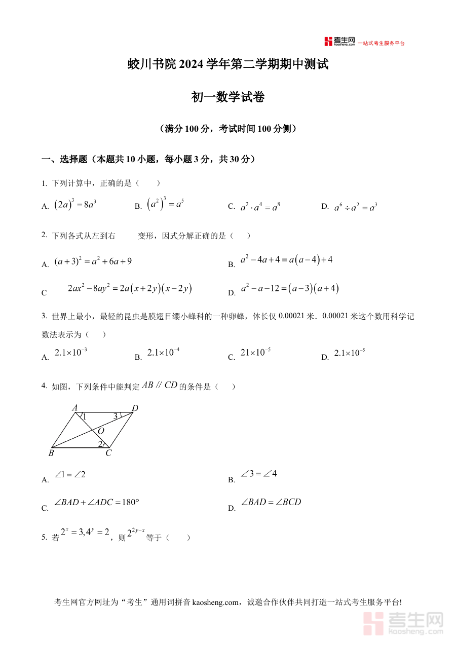 《精品解析:浙江省宁波市镇海蛟川书院2024-2025学年七年级下学期期中考试数学试题(原卷版)》是针对浙江省宁波市镇海蛟川书院2024至2025学年七年级下学期期中考试设计的数学备考资料,精准匹配该学年该阶段的数学考试需求,为相关使用者提供贴合实际考试场景的原卷内容参考。