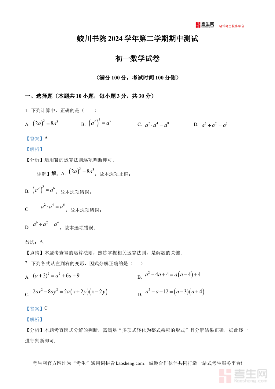 《精品解析:浙江省宁波市镇海蛟川书院2024-2025学年七年级下学期期中考试数学试题(解析版)》是针对特定阶段数学考试的专业备考资料,其覆盖年份为2024-2025学年,地区限定于浙江省宁波市镇海蛟川书院,考试类型为七年级下学期期中考试。作为解析版资料,它不仅包含试题本身,还提供了对应的详细解析内容,能够帮助使用者准确把握该阶段数学考试的考查方向和核心要求,为相关学习活动提供明确且专业的参考依据。