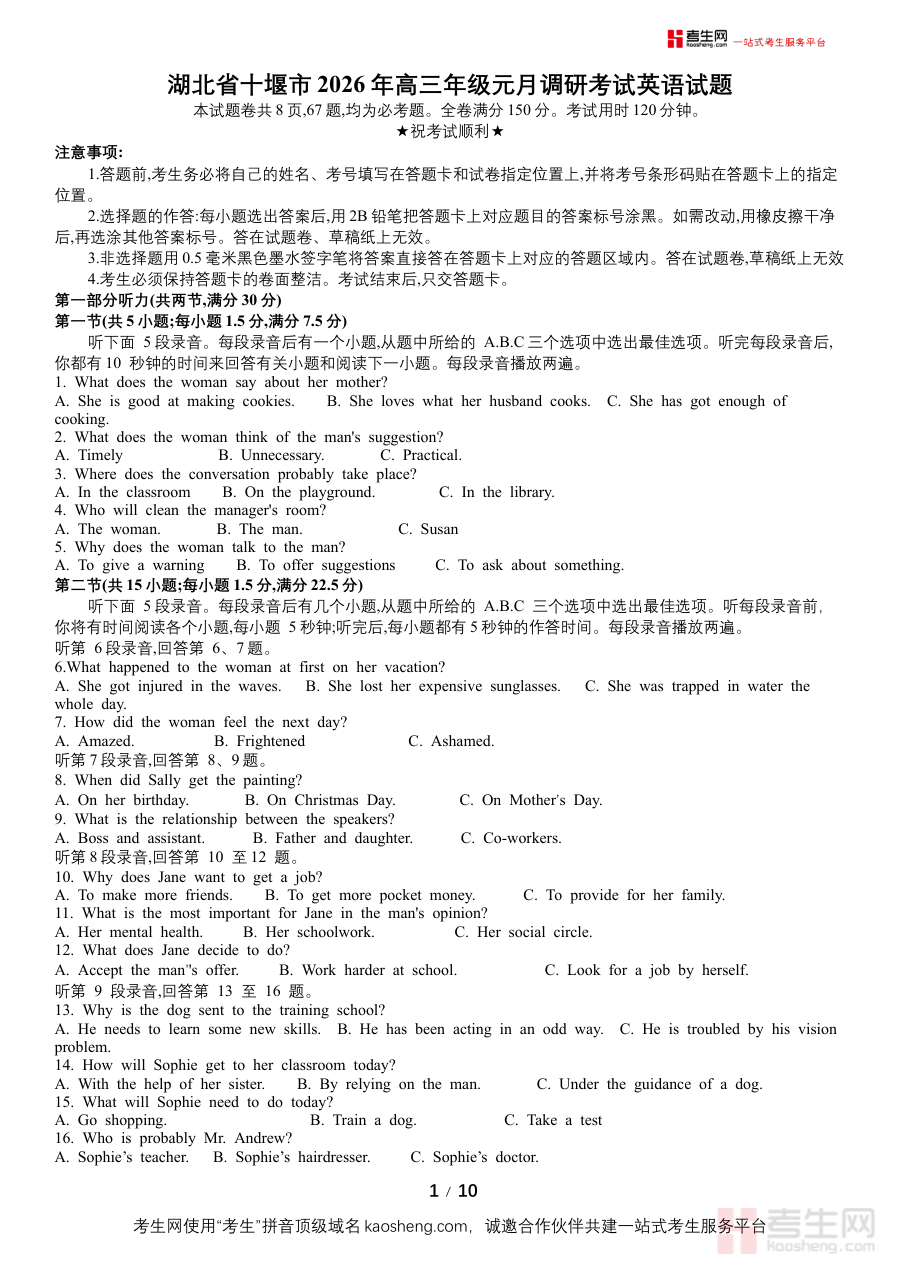 《湖北省十堰市2026届高三年级元月调研考试一模英语试题》是针对湖北省十堰市2026届高三学生设计的阶段性模拟考试资料,其中2026届为该届学生的毕业年份,元月调研考试是高三上学期末期的重要检测环节,一模则标志着高考备考进入系统性模拟训练阶段,该试题是适配这一特定考试场景的专用备考资源。