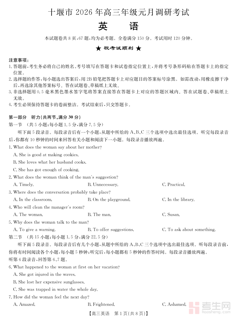 该试题主要适用于湖北省十堰市2026届高三学生及相关英语教师。对学生而言,它既是阶段性学习成果的检验机会,也能帮助其熟悉考试流程与时间分配,提升应试能力;对教师来说,它为教学评估与备考指导提供客观依据,有助于优化教学计划,辅助学生在后续高考复习中取得更优效果。