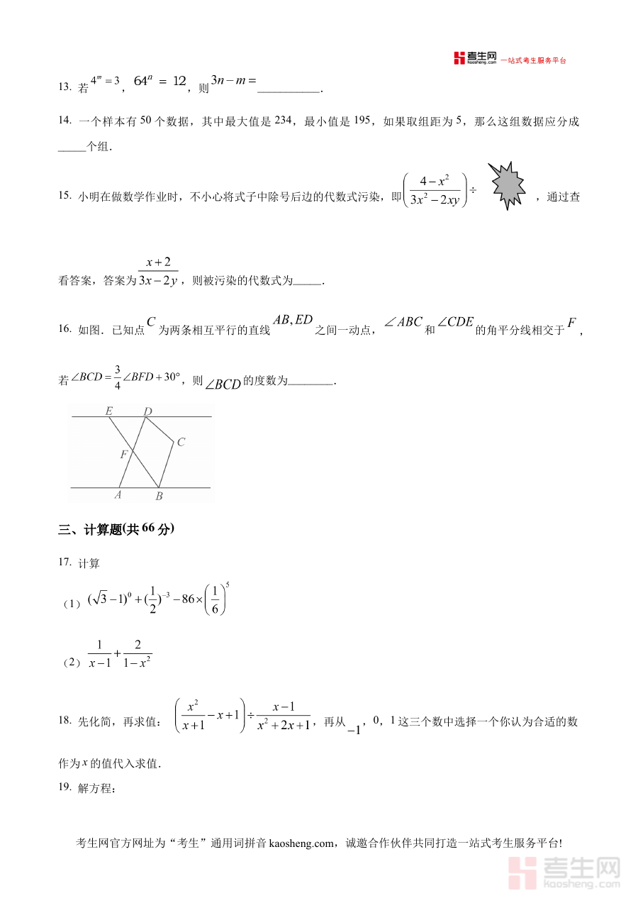 该资料可用于七年级学生进行期末数学考试的考前模拟与自我检测,帮助教师了解学生对学期数学知识的掌握情况,辅助开展学情诊断与备考规划工作,为教学调整和学习指导提供依据。
