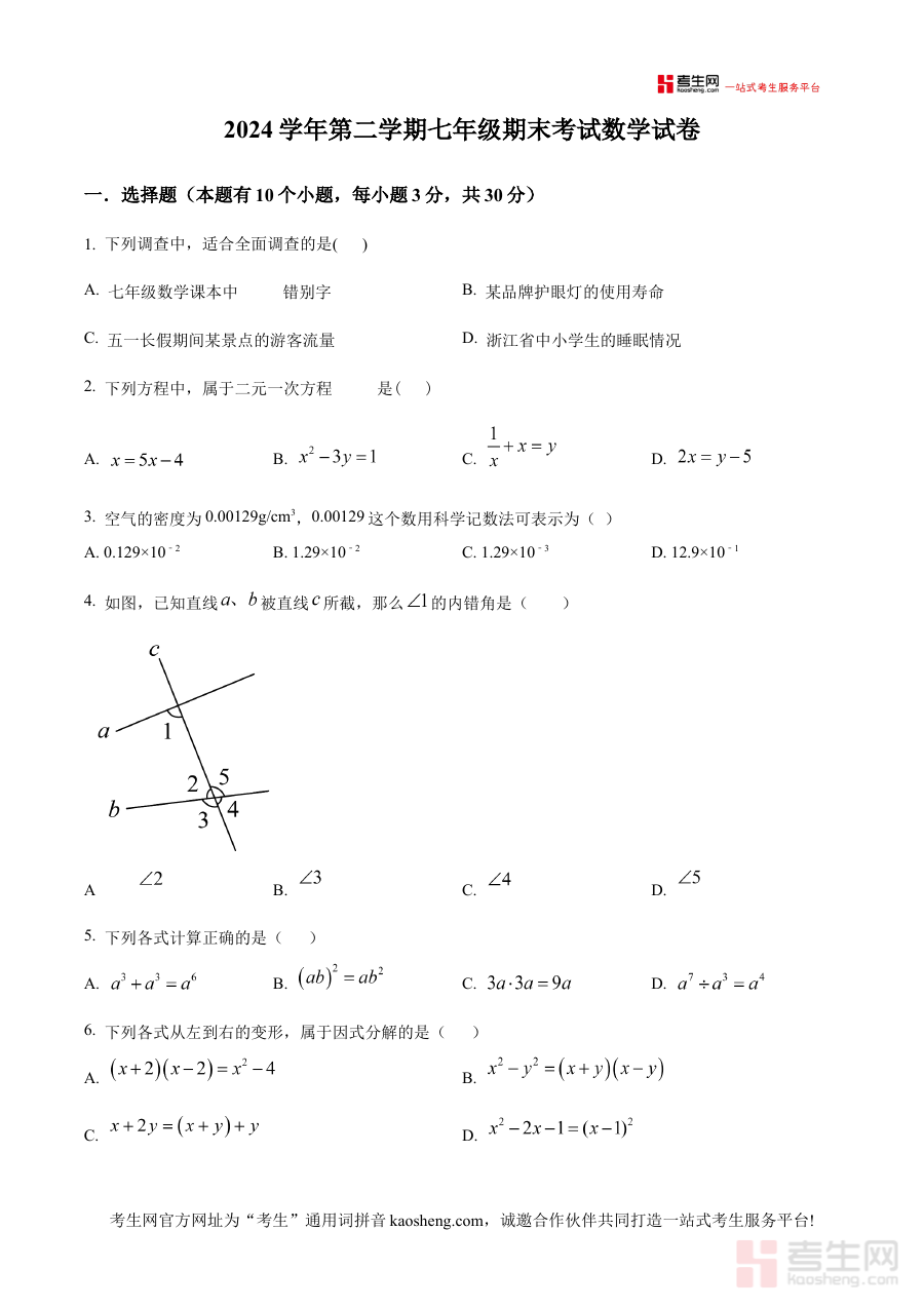 《精品解析:浙江省宁波市鄞州区2024-2025学年七年级下学期6月期末数学试题(原卷版)》是针对浙江省宁波市鄞州区2024-2025学年七年级下学期6月期末数学考试的配套备考资料,精准对应该地区该学年该阶段的数学期末检测需求,为使用者提供与本地考试体系匹配的原卷形式资料。